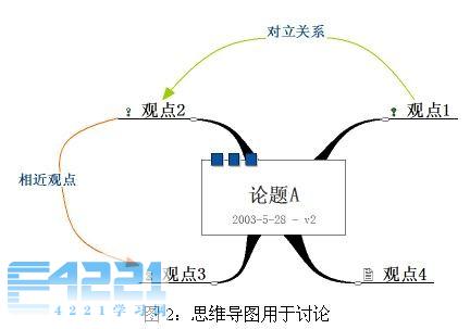 其实,思维导图不仅可以用于做笔记,还在制定计划、组织讨论等方面有用途。例如讨论问题时,可以由一人担任秘书工作,把整个讨论用思维导图的形式画出来。(如图2所示)