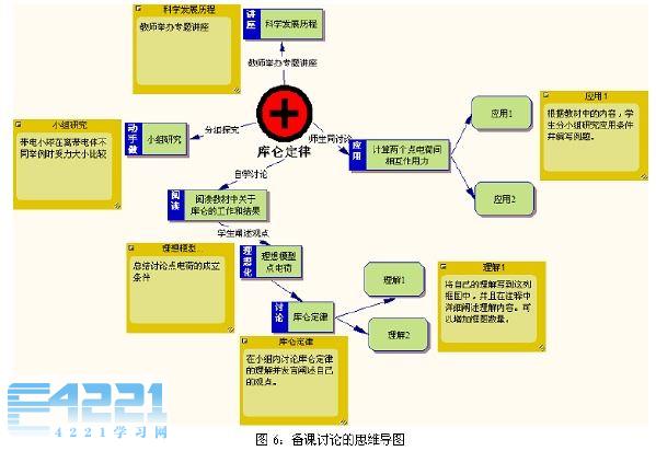 备课是重要教学行为,如何才能提高备课的效果呢?除了教师自己认真研读教材、教学大纲、查阅有关资料之外,教师之间的讨论也是提高备课效果的重要方式,这样可以做到集思广益,智慧大家共享。然而在通常的备课过程中由于缺乏及时有效的记录和整理,集体讨论效果不好,而且容易跑题。现在我们按照思维导图的方法,利用inspiration软件记录备课过程,然后进行必要的整理,就避免了上述情况,图6是在一次集体备课中讨论"库仑定律"的教学时最终绘制的思维导图。