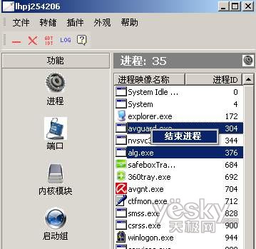 打开《冰刃》,点击“进程”,通过“进程ID”列找到两个病毒进程(图5),然后结束这两个进程即可。这时杀毒软件应该可以成功运行,剩下的病毒残留物的清除工作就可以交给杀毒软件来完成。
