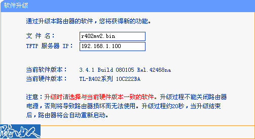 大部分型号路由器采用WEB页面升级的方式,TFTP针对使用TL-R402系列路由器用户的升级。