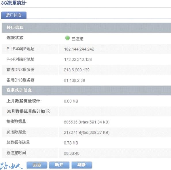 点击VOLANS路由器界面中的3G流量统计,可看到3G网卡通过VOLANS路由器上外网的相关流量统计。