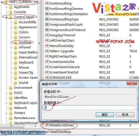 3)点击Dasktop在右边框中找到WheelScrollLines,原来的值为3,我们可以自己修改。