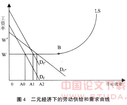 变量上。因此有利于劳动力收入的政策和技术进步,即(GL-GK)<0,总是会降低总体基尼系数,有利于收入差距的缩小。但是在劳动力过剩的发展中国家,由于二元经济的存在,在转折点B之前(见图4),农业劳动收入低于制度性工资,在经济发展过程中,工资几乎不变或者只有微幅的提高。在转折点B之后,劳动供给曲线LS才会向上倾斜,工资才会上升。但是在转折点之前,资本节约型技术对劳动的需求曲线Df′比劳动节约型技术对劳动需求曲线Df更有助于农业劳动向非农业劳动的转移,提高社会的劳动就业,提高φ′W。的份额;在不改变资本和劳动比率条件下的中性技术进步和创新也可以提高劳动工资份额和资本收益,使得厂商对劳动的需求曲线向右移动,例如D′f因此只要是技术进步和创新频率的上升总是具有提高劳动要素收入和扩大吸引劳动力的双重效用,可以提高φ′W的份额等,有利于降低总体基尼系数。