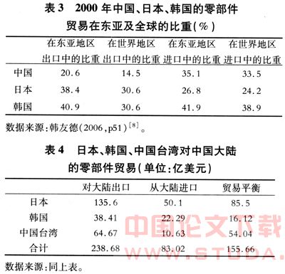 这种基于生产阶段分工的形成对亚洲地区的贸易流向和贸易结构产生了显著的影响。其中最大特征是大量日本、韩国、中国台湾、新加坡的企业通过对华直接投资,将其最后一道工序转移到中国大陆和东盟等国家,而中国大陆和东盟国家则从上述国家和地区大量进口零部件。这一点,可以从我国的零部件贸易在东亚及全球的地位(表3),以及日本、韩国、中国台湾等国家和地区对我国的零部件贸易平衡数据(表4)中明显看出。 2000年,中国大陆从东亚地区进口的零部件达347.5亿美元,其中有135.6亿美元来自日本,64.67亿美元来自台湾,有38.4亿美元来自韩国。这种贸易流向的变化构成了近年来东亚各国和地区对外贸易平衡的不同的变化和走势。