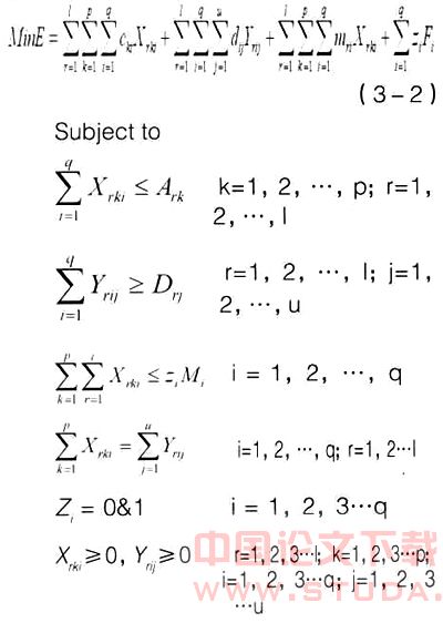 2.模型构造。模型的目标函数是从具有一定生态位适宜度的备选地点中选出一定数量的点作为最佳配送中心,不仅使从供货点到配送中心的运输费用、配送中心到用户的运输费用、流经配送中心的产品管理费用以及配送中心的固定投资费用的总和最少,而且要具有很强的适应性。因此,目标函数要使物流费用最小,所以可用公式表达如下: