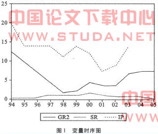 首先,作变量SR、GR、IP时序图(见图1),初步判断序列平稳性,识别变量截距、趋势特征。从图1可以看出,各变量可能不平衡,且都有截距项。