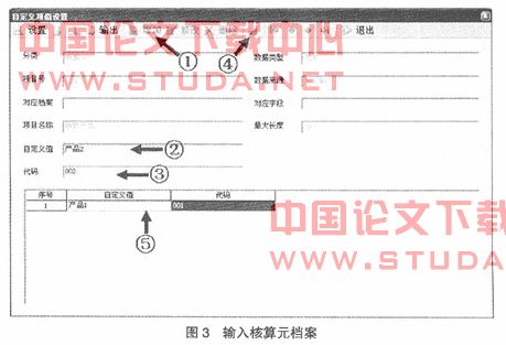 当完成对核算元的定义和操作设置后,在“自定义项类别”窗口的菜单中,点击“档案”菜单,进入核算元档案的输入窗口(图3)。按照下列步骤操作: