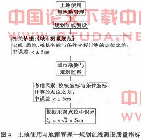首先,数据质量是一个相对的概念,甚至衡量数据质量的标准也会随具体应用的特点和要求而变化。其次,数据质量本身具有不确定性,除了可度量的空间和属性误差外,许多质量因素是很不明显或是很难确定的。因此,数据质量问题中,有可以减小甚至消除的误差,也有很难检测和控制的因素。本文研究数字城市空间管治信息的数据质量控制,先仅针对其中可度量和可控制的质量问题而言的,主要集中在数据源的信息采集、数字化处理和过程部分。数据质量不确定性另设专题研究。例如土地使用与地籍管理单项空间管治数据质量指标确定一规划红线测设质量指标确定如图4所示。限于篇幅,各单项空间管治数据质量指标不再一一列出。