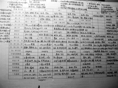 网上热传的一张计划表显示,早上6点“起床锻炼”……中午11点25分-13点30分“吃午饭,打印课件”……晚上10点到11点“听英语”,晚上11点到凌晨1点“读《飘》,背单词”,凌晨一点之后“SLEEP”。每天只睡五六个小时。