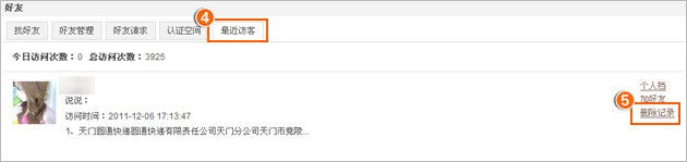 温馨提示: 目前好友来您QQ空间访问过,您或好友本人操作删除本次QQ空间最近访客(来访记录),但在好友自己空间个人中心里“我看过谁”,仍然可以看到好友曾经访问过的最近10个空间的记录。