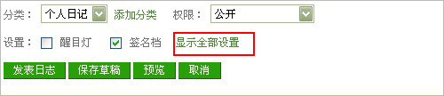第一步:登录您QQ空间,进入日志,在写日志的界面最下方的设置栏目里选择“显示全部设置”;